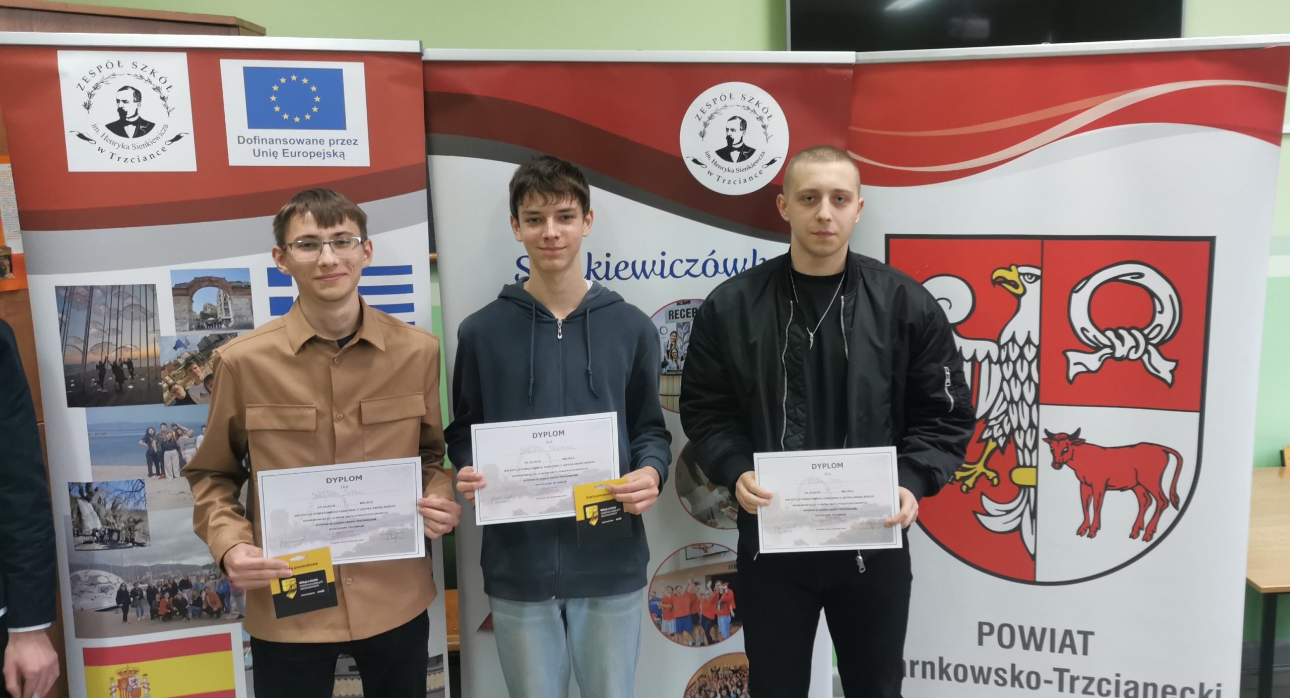 Troje uczniów z naszej szkoły wzięło udział w Powiatowym Konkursie Języka Angielskiego zorganizowanym w Zespole Szkół im. Henryka Sienkiewicza w Trzciance pod patronatem Powiatu Czarnkowsko-Trzcianeckiego dla uczniów szkół ponadpodstawowych. Uczniowie napisali najpierw test leksykalno-gramatyczny, a następnie musieli wypowiedzieć się na dwa wylosowane tematy.