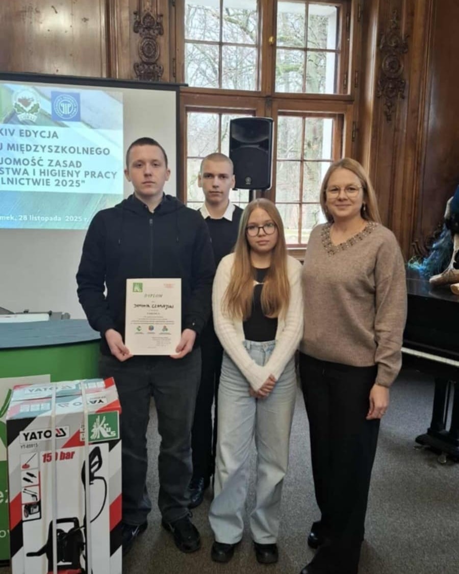 Miło nam Państwa poinformować, że uczeń kształcący się w zawodzie technik mechatronik – Dominik Czabajski z klasy 2 TLM, został indywidualnym zwycięzcą XIV edycji Międzyszkolnego Konkursu „Znajomość zasad bezpieczeństwa i higieny pracy w rolnictwie 2025”. Po kilkuetapowych zmaganiach etapu regionalnego z zakresu przepisów BHP oraz Prawa Pracy w obszarze rolnictwa Dominik Czabajski uplasował się na 1 miejscu indywidualnie. Wraz z nim w konkursie uczestniczyli uczniowie – Zuzanna Pielach 1 TLŻ oraz Mikołaj Kalupą z 2 TLM.