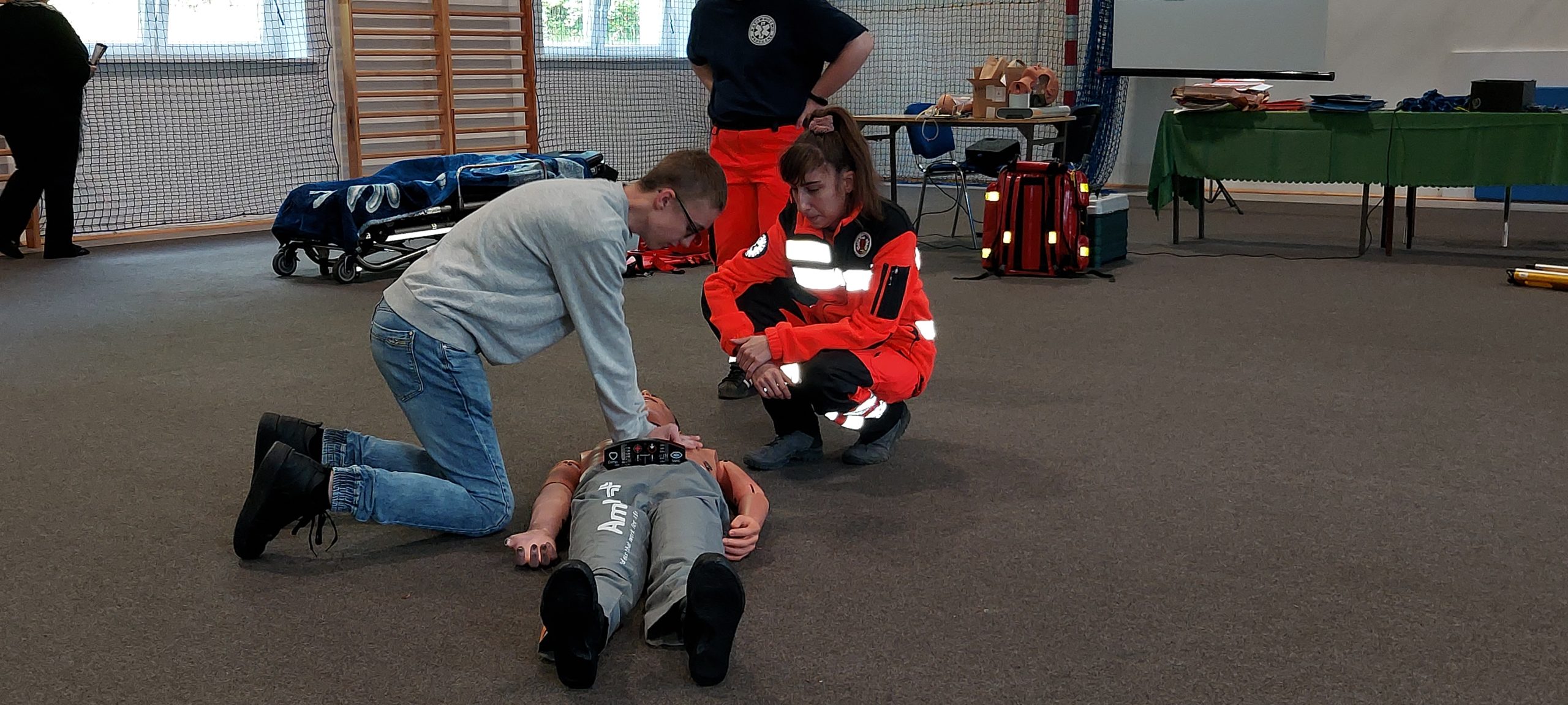 Główną część warsztatową były pokazy ratownictwa medycznego pod hasłem „Pierwsza pomoc przedmedyczna – wiedza ma moc – możesz uratować komuś życie”. Przedstawiciele Katedry Ratownictwa Medycznego Akademii Nauk Stosowanych im. Stanisława Staszica w Pile zaprezentowali kilka scenek pozorowanych z zakresu pierwszej pomocy przedmedycznej, przedstawili ciekawe filmiki instruktażowe oraz poprowadzili krótkie wykłady teoretyczne. Nasi uczniowie mogli spróbować swoich sił przy intubacji dotchawicznej czy założeniu wenflona. Inspektorzy Pracy przedstawili cykl krótkich wykładów pod hasłem „Poznaj swoje prawa w pracy”. Uczniowie pozyskali wiele cennych informacji dotyczących pośrednictwa pracy, poradnictwa zawodowego oraz zapoznali się ze środkami ochrony indywidualnej wymaganymi na różnych stanowiskach pracy. Po zakończeniu spotkania skorzystaliśmy z okazji i wybraliśmy się na krótką wędrówkę wśród przepięknych gorajskich lasów bukowych, gdzie młodzież wykazała się wspaniałą orientacją w terenieJ.
