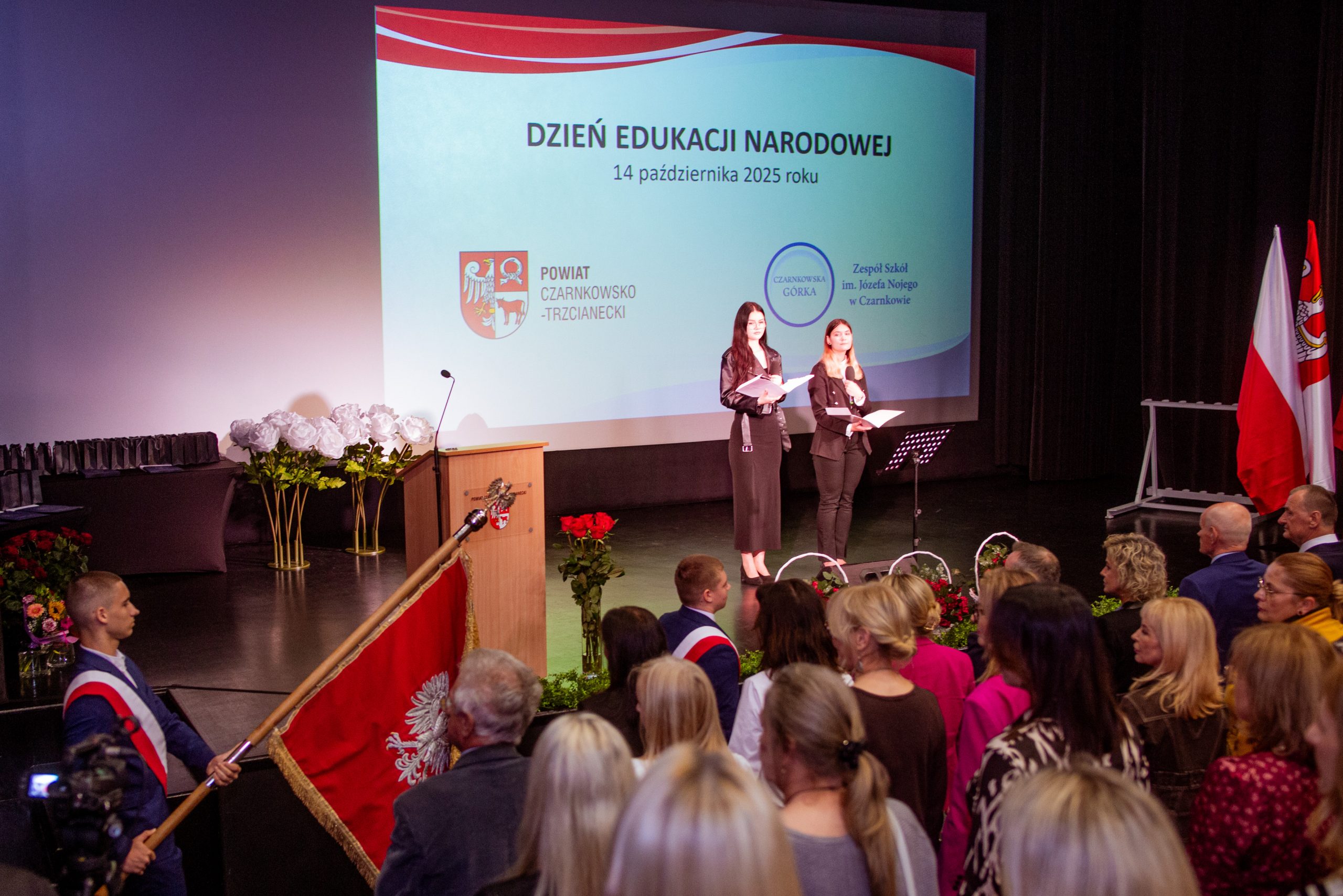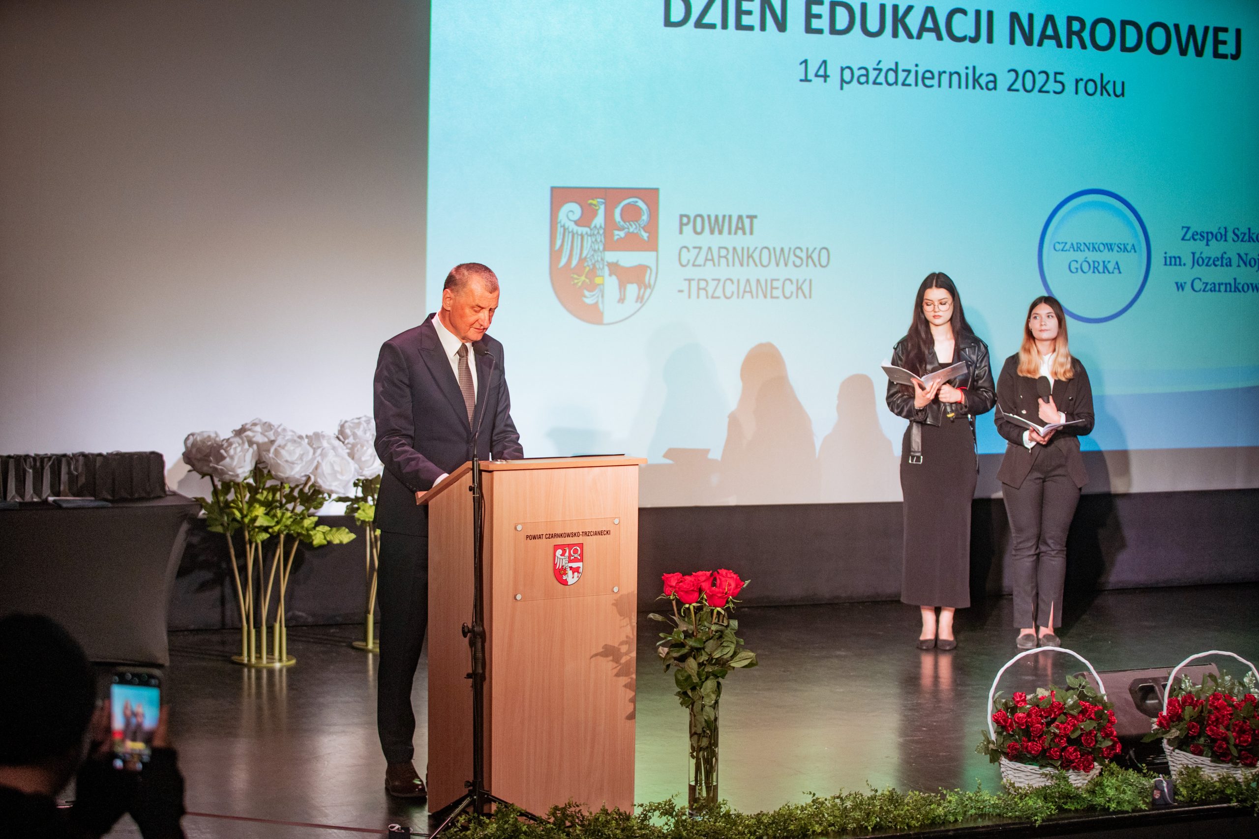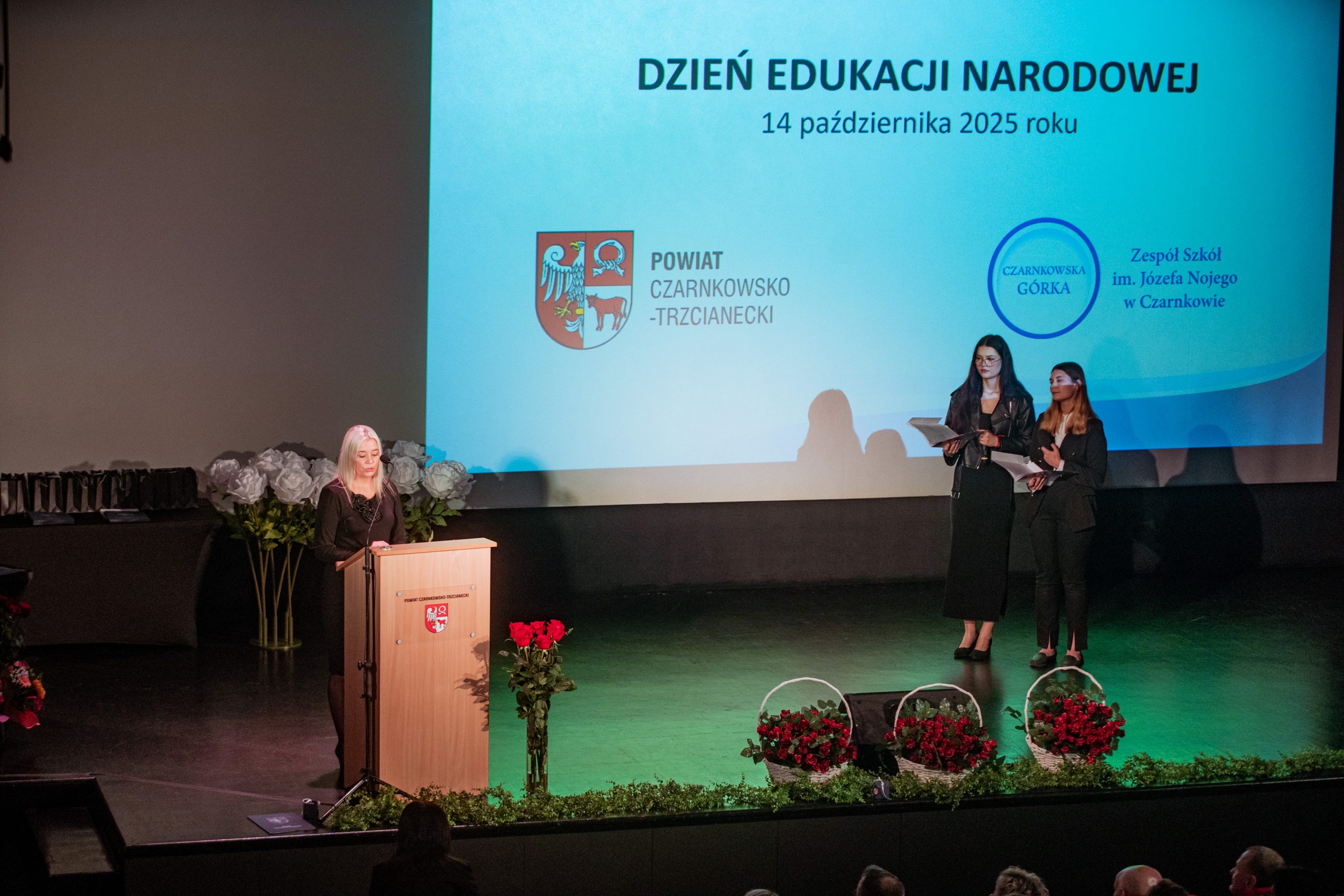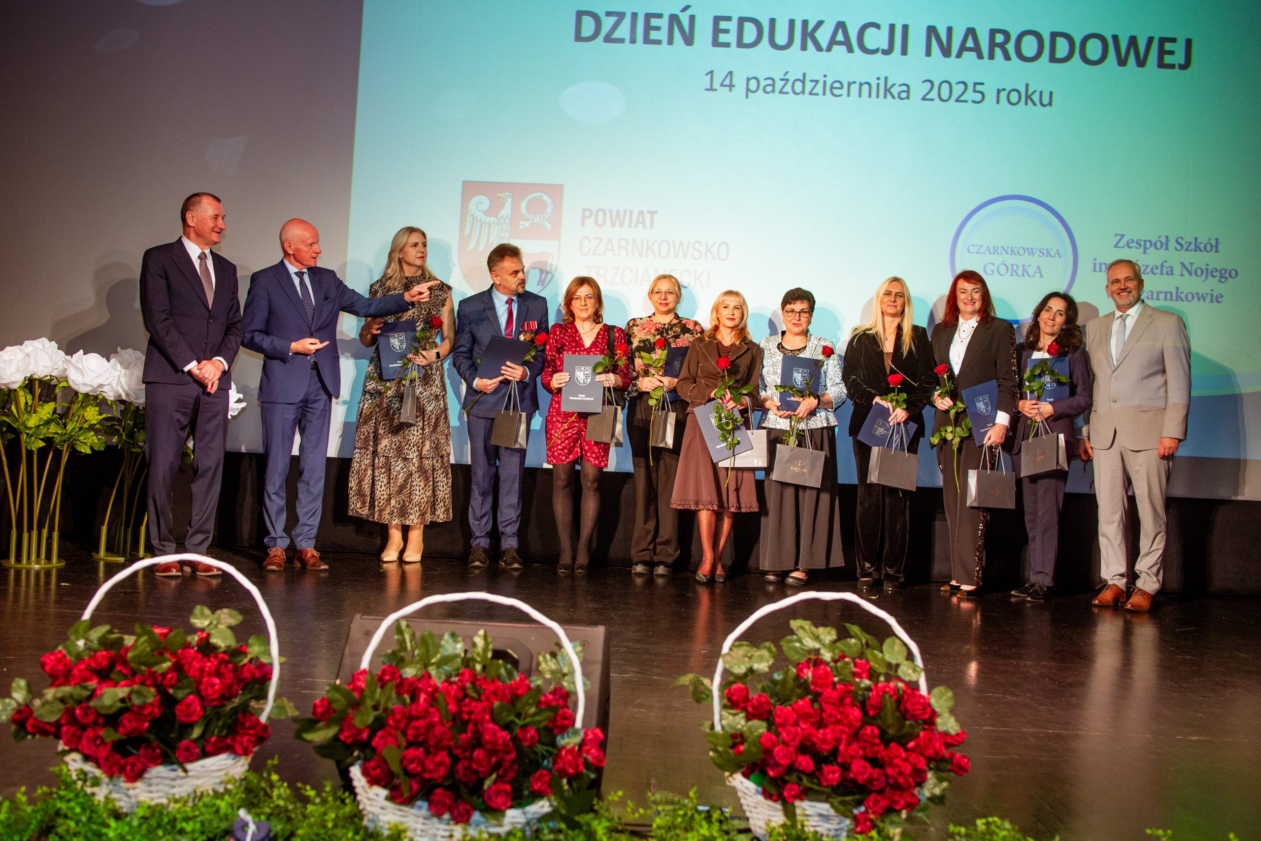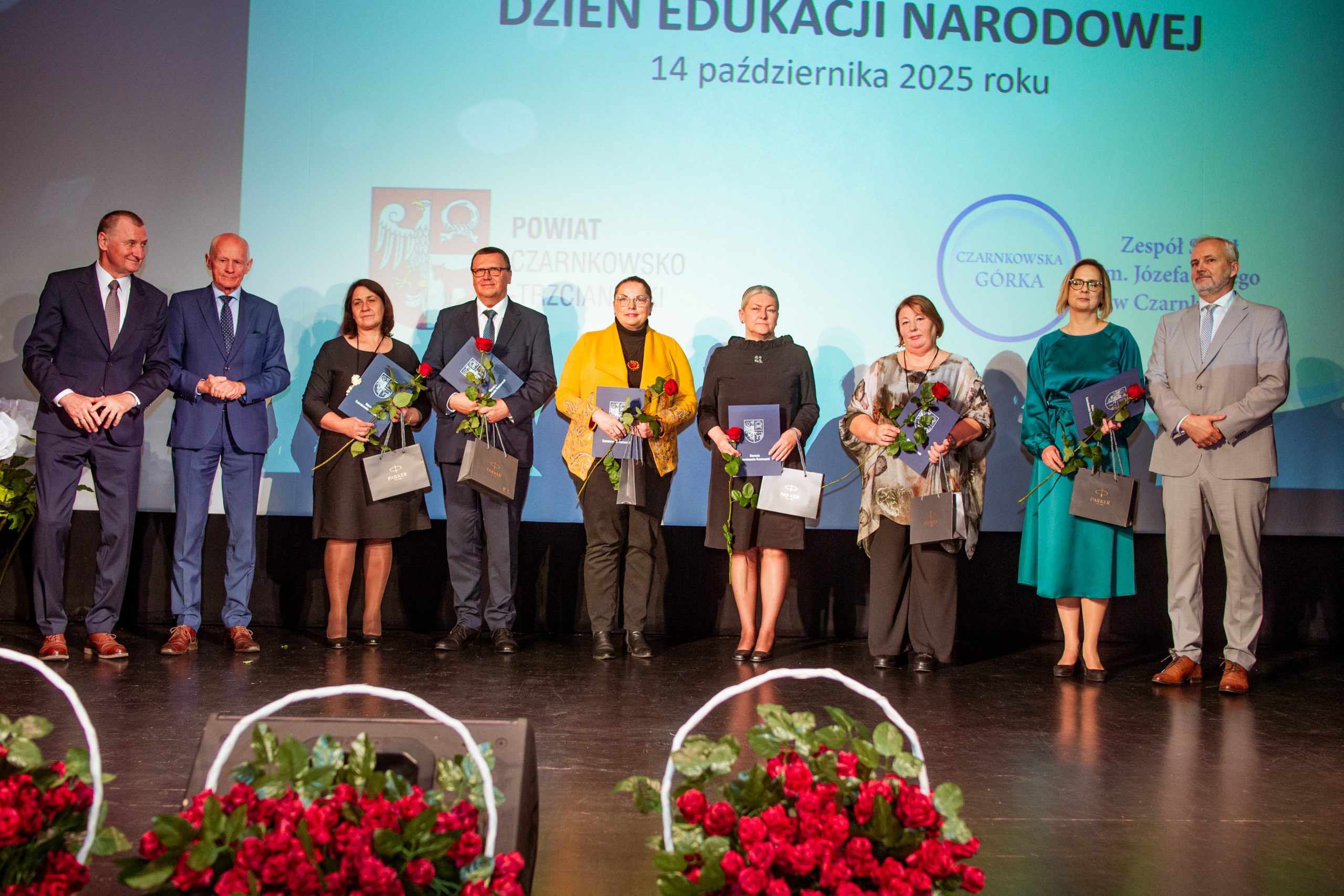 Te piękne słowa zabrzmiały w murach Miejskiego Centrum Kultury w Czarnkowie, podczas obchodów Powiatowego Dnia Edukacji Narodowej. Na uroczystości nie mogło zabraknąć „ludzi oświaty”: nauczycieli, pracowników administracji i obsługi, uczniów, rodziców i gości. Tegorocznymi współgospodarzami byli: Starosta Czarnkowsko – Trzcianecki Pan Grzegorz Bogacz oraz Dyrektor Zespołu Szkół im. Józefa Nojego w Czarnkowie Pan Jan Palacz. Oficjalnego otwarcia obchodów dokonał Pan Tadeusz Teterus Wicestarosta Czarnkowsko – Trzcianecki. Następnie miały miejsce wystąpienia gości, wśród których swoje życzenia dla społeczności szkolnej złożyli: Dyrektor Delegatury w Pile Kuratorium Oświaty w Poznaniu Pan Jacek Skowroński, Dyrektor Powiatowego Urzędu Pracy w Czarnkowie Pani Marzena Jackowska, Przewodnicząca Rady Rodziców szkoły, Pani Agnieszka Szuszkowska, Komendant Powiatowy Państwowej Straży Pożarnej w Czarnkowie mł. bryg. Michał Macyszyn, Wiceprezes Zarządu Forum Gospodarczego – Związek Pracodawców Północnej Wielkopolski Lewiatan Pani Justyna Przybył oraz przedstawiciele lokalnych firm Meblomoru i Steico. Uczniowie „Czarnkowskiej Górki”, prowadzący uroczystość podkreślili uzyskanie przez dyrektora szkoły Tytułu Honorowego Profesora Oświaty 2025, między innymi za jakość prowadzonej pracy z uczniami, wysoki poziom kultury pedagogicznej, otrzymanie najważniejszych medali, nagród i odznaczeń państwowych, czy publikacje dotyczące oświaty i problematyki edukacyjnej. Uczniowie zaznaczyli, że pomimo, że dyrektor Jan Palacz odbiera prestiżowy tytuł w Warszawie, jest zawsze sercem obecny z uczniami. Naczelnik Wydziału Edukacji Pan Ryszard Jabłonowski wręczył nagrody organu prowadzącego nauczycielom, dyrektorom szkół, pedagogom. Czarnkowska Górka oprócz tytułu Honorowy Profesor Oświaty uzyskanego przez dyrektora szkoły może poszczycić się wieloma nagrodami nie tylko na szczeblu powiatu, ale również kraju. Wśród nagrodzonych znaleźli się: Pan Artur Kopka – Nagroda Ministra Edukacji Narodowej, Pani Maria Kaczorowska – Nagroda Wielkopolskiego Kuratora Oświaty, Panie Katarzyna Bielejewska, Izabela Grun, Monika Jabłonowska – Nagroda Starosty Czarnkowsko – Trzcianeckiego, Pan Waldemar Kryjewski – Medal Srebrny za Długoletnią Służbę. Do tego szanownego grona należy dołączyć nauczycieli, którzy zostali nominowani do odznaczeń: Pani Lucyna Kalkowska – Srebrny Krzyż Zasługi, Panie Magdalena Domagała, Monika Jabłonowska – Medal Komisji Edukacji Narodowej. Nauczyciele, pracownicy administracji i obsługi, za swoją pracę i zaangażowanie uzyskali Nagrodę Dyrektora.