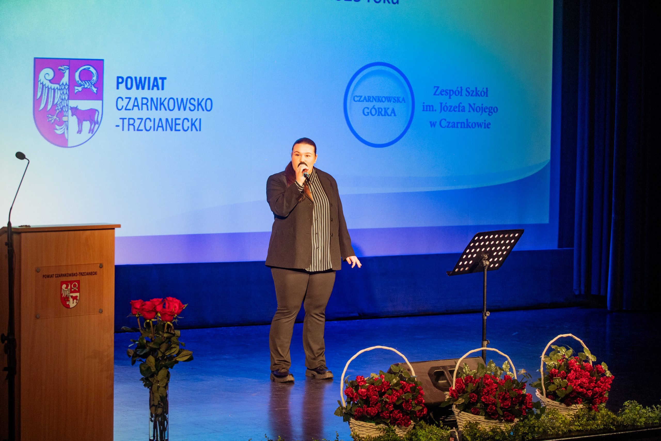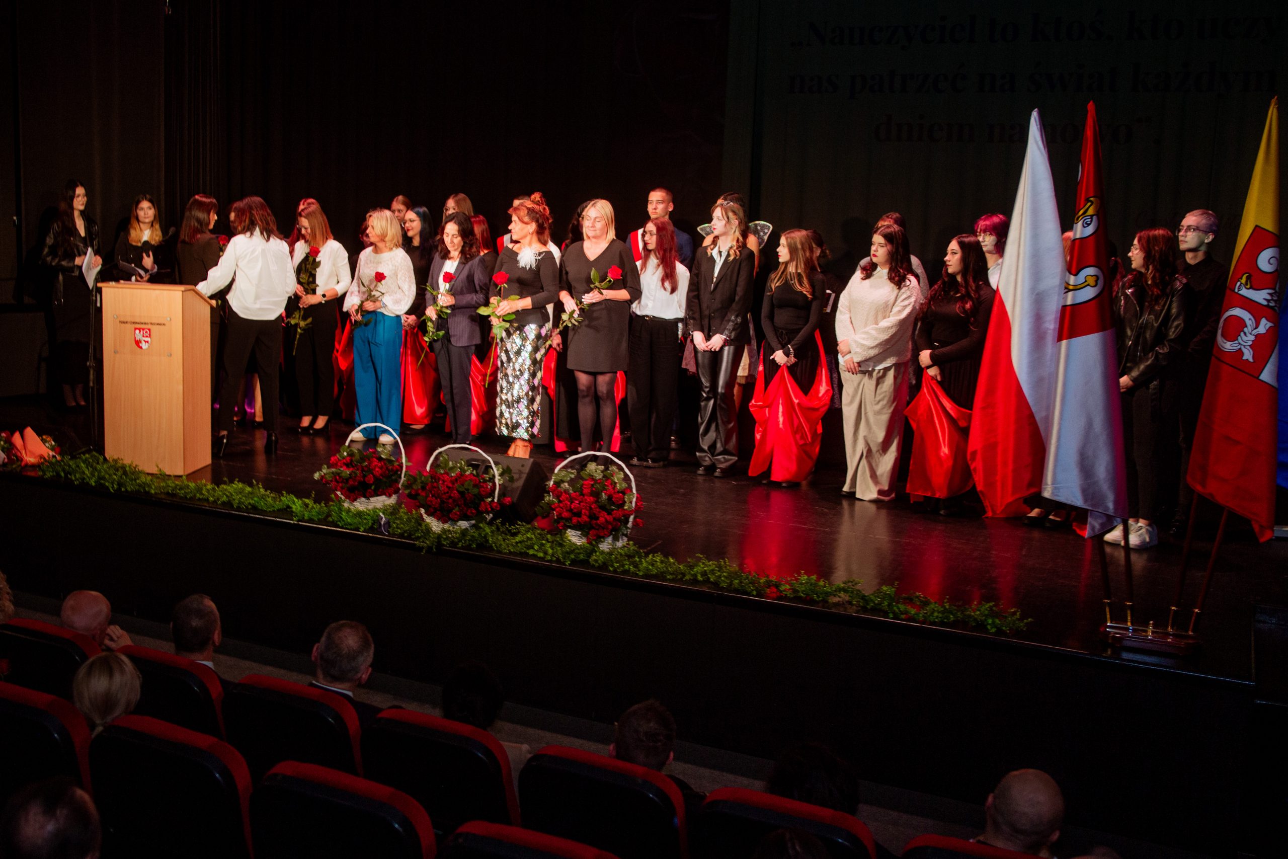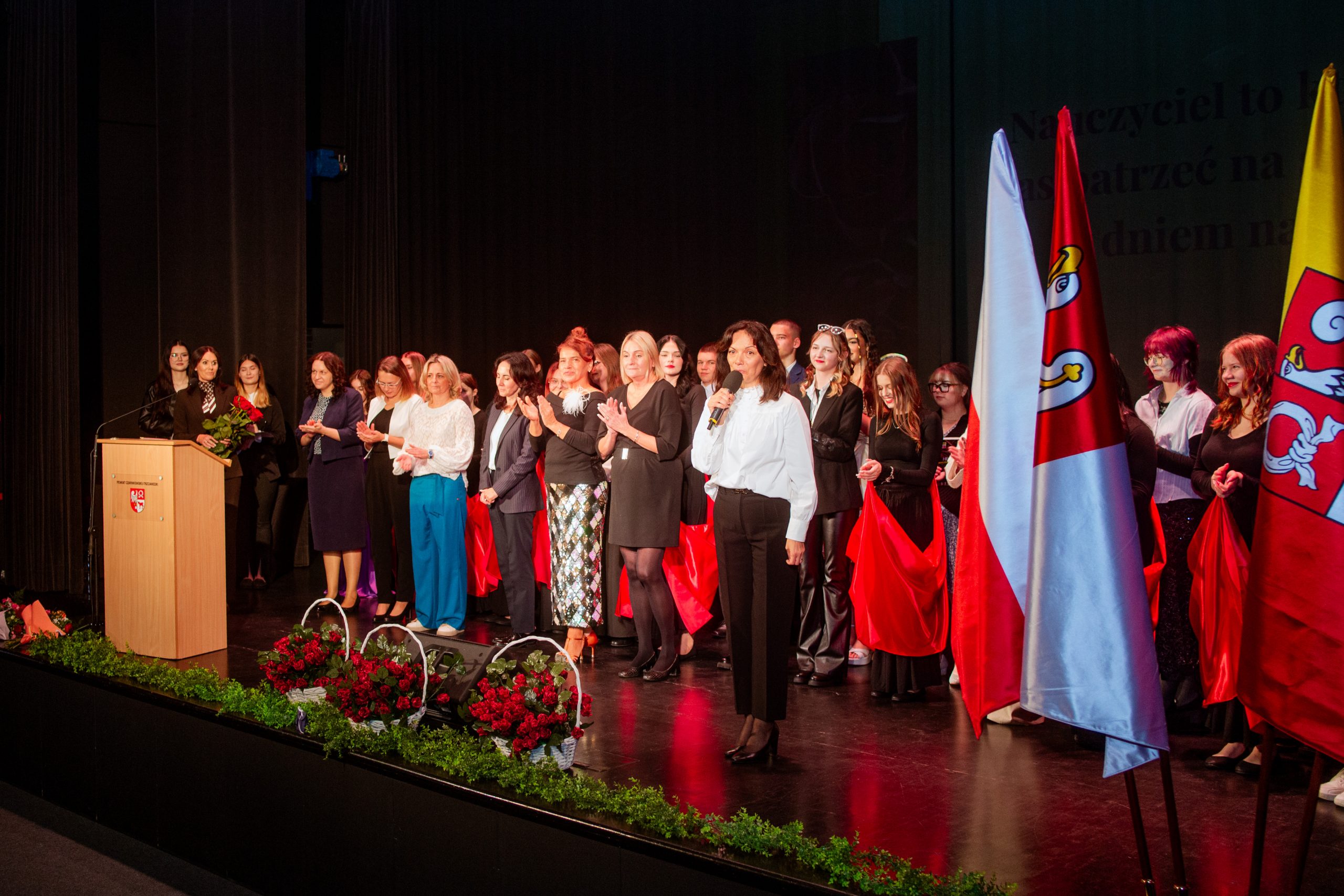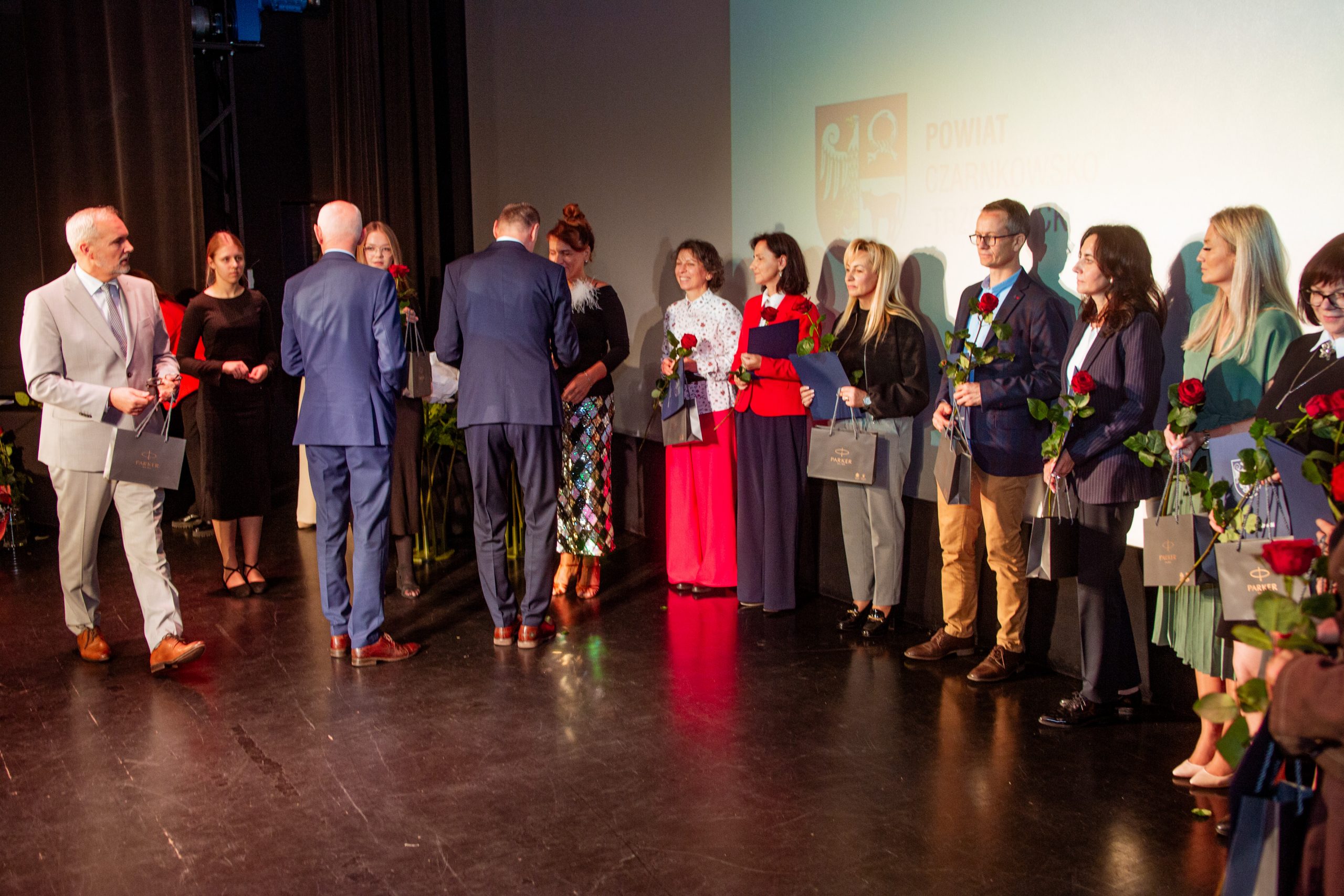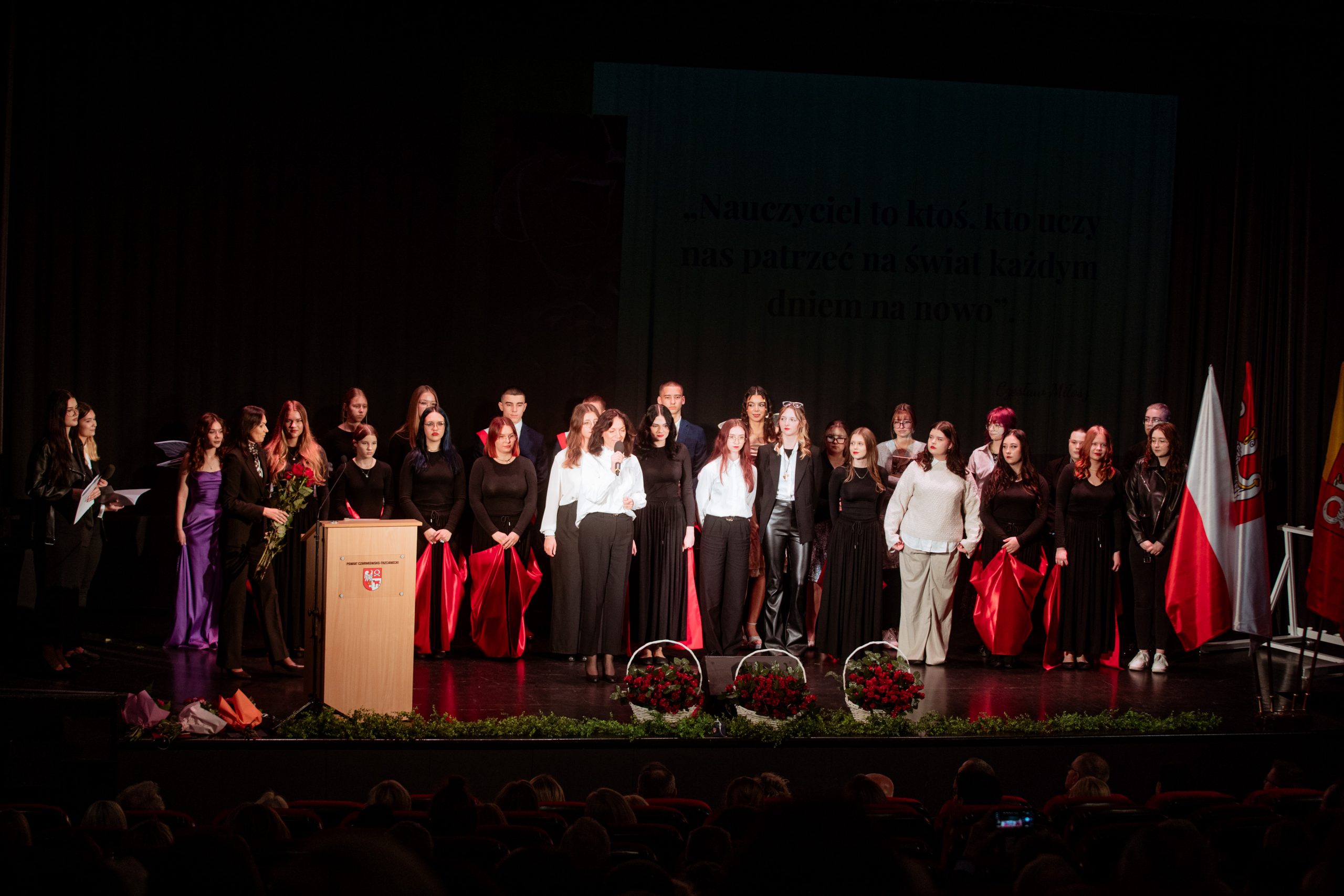 Te piękne słowa zabrzmiały w murach Miejskiego Centrum Kultury w Czarnkowie, podczas obchodów Powiatowego Dnia Edukacji Narodowej. Na uroczystości nie mogło zabraknąć „ludzi oświaty”: nauczycieli, pracowników administracji i obsługi, uczniów, rodziców i gości. Tegorocznymi współgospodarzami byli: Starosta Czarnkowsko – Trzcianecki Pan Grzegorz Bogacz oraz Dyrektor Zespołu Szkół im. Józefa Nojego w Czarnkowie Pan Jan Palacz. Oficjalnego otwarcia obchodów dokonał Pan Tadeusz Teterus Wicestarosta Czarnkowsko – Trzcianecki. Następnie miały miejsce wystąpienia gości, wśród których swoje życzenia dla społeczności szkolnej złożyli: Dyrektor Delegatury w Pile Kuratorium Oświaty w Poznaniu Pan Jacek Skowroński, Dyrektor Powiatowego Urzędu Pracy w Czarnkowie Pani Marzena Jackowska, Przewodnicząca Rady Rodziców szkoły, Pani Agnieszka Szuszkowska, Komendant Powiatowy Państwowej Straży Pożarnej w Czarnkowie mł. bryg. Michał Macyszyn, Wiceprezes Zarządu Forum Gospodarczego – Związek Pracodawców Północnej Wielkopolski Lewiatan Pani Justyna Przybył oraz przedstawiciele lokalnych firm Meblomoru i Steico. Uczniowie „Czarnkowskiej Górki”, prowadzący uroczystość podkreślili uzyskanie przez dyrektora szkoły Tytułu Honorowego Profesora Oświaty 2025, między innymi za jakość prowadzonej pracy z uczniami, wysoki poziom kultury pedagogicznej, otrzymanie najważniejszych medali, nagród i odznaczeń państwowych, czy publikacje dotyczące oświaty i problematyki edukacyjnej. Uczniowie zaznaczyli, że pomimo, że dyrektor Jan Palacz odbiera prestiżowy tytuł w Warszawie, jest zawsze sercem obecny z uczniami. Naczelnik Wydziału Edukacji Pan Ryszard Jabłonowski wręczył nagrody organu prowadzącego nauczycielom, dyrektorom szkół, pedagogom. Czarnkowska Górka oprócz tytułu Honorowy Profesor Oświaty uzyskanego przez dyrektora szkoły może poszczycić się wieloma nagrodami nie tylko na szczeblu powiatu, ale również kraju. Wśród nagrodzonych znaleźli się: Pan Artur Kopka – Nagroda Ministra Edukacji Narodowej, Pani Maria Kaczorowska – Nagroda Wielkopolskiego Kuratora Oświaty, Panie Katarzyna Bielejewska, Izabela Grun, Monika Jabłonowska – Nagroda Starosty Czarnkowsko – Trzcianeckiego, Pan Waldemar Kryjewski – Medal Srebrny za Długoletnią Służbę. Do tego szanownego grona należy dołączyć nauczycieli, którzy zostali nominowani do odznaczeń: Pani Lucyna Kalkowska – Srebrny Krzyż Zasługi, Panie Magdalena Domagała, Monika Jabłonowska – Medal Komisji Edukacji Narodowej. Nauczyciele, pracownicy administracji i obsługi, za swoją pracę i zaangażowanie uzyskali Nagrodę Dyrektora.