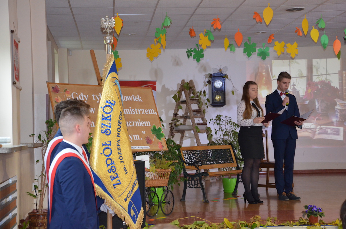 11 października 2019r. o godz. 14.00 odbyła się uroczysta akademia z okazji Dnia Edukacji Narodowej. Wśród zaproszonych gości znaleźli się Wicestarosta Czarnkowsko – Trzcianecki Sławomir Kryger, Naczelnik Wydziału Edukacji Ryszard Jabłonowski, Dyrektor Centrum Kształcenia Zawodowego w Czarnkowie Małgorzata Wylegała, kadra kierownicza i nauczyciele Zespołu Szkół im. Józefa Nojego w Czarnkowie oraz Centrum Kształcenia Zawodowego, pracownicy oświaty i obsługi oraz szanowni nauczyciele emeryci i byli pracownicy szkoły. Gości przywitali nasi uczniowie częstując słodką niespodzianką oraz zakładką z myślą-cytatem z dziedziny życia i edukacji. Akademia rozpoczęła się od wprowadzenia pocztu sztandarowego i odśpiewania hymnu państwowego, co nadało powagi uroczystości.