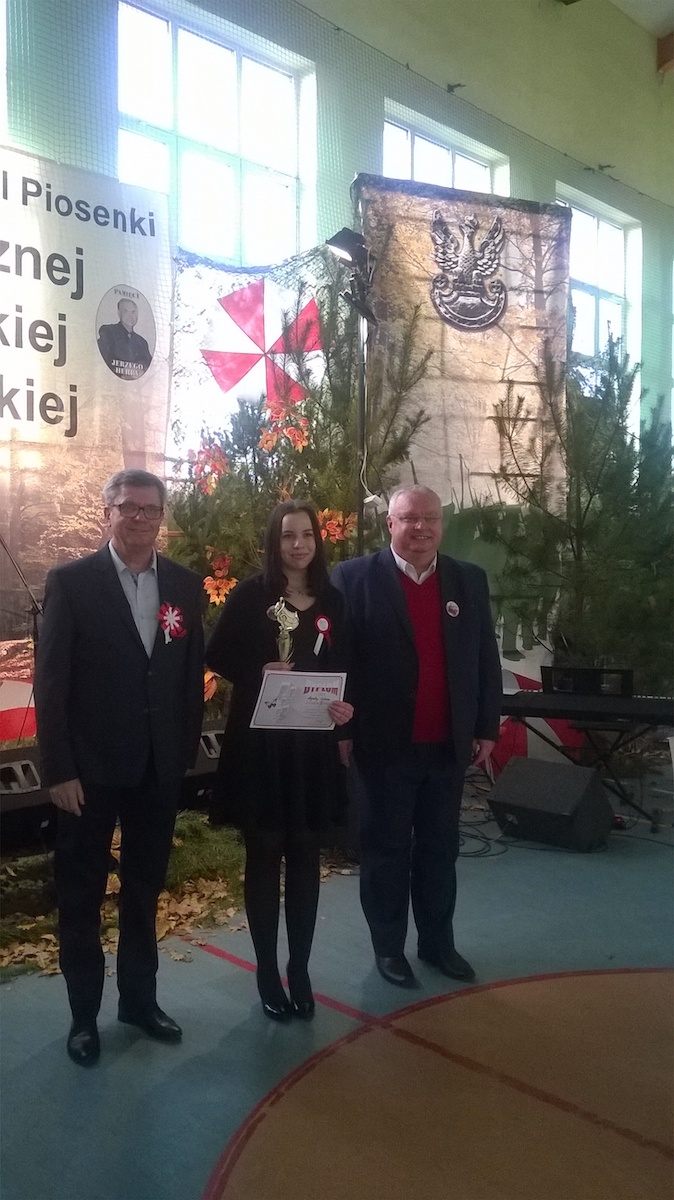 15 listopada w Szkole Podstawowej im. Powstańców Wielkopolskich 1918/1919 w Kuźnicy Czarnkowskiej przy wsparciu Starostwa Powiatowego w Czarnkowie i Urzędu Gminy w Czarnkowie po raz 21 rozbrzmiewały piosenki patriotyczne, żołnierskie i harcerskie w wykonaniu dzieci ze szkół podstawowych, młodzieży z gimnazjum i szkół ponadgimnazjalnych. Konkurs odbył się w 3 kategoriach wiekowych. W ostatniej z nich wystąpiły dwie uczennice Zespołu Szkół Ponadgimnazjalnych w Czarnkowie: Julia Golon z klasy I LŻ reprezentująca „Górkę” oraz Agata Golon z klasy II EH jako reprezentantka Rady Młodzieży Powiatu Czarnkowsko-Trzcianeckiego „Most”. Julia piosenką „Panie Generale” „wyśpiewała” I miejsce, Agata zdobyła III miejsce piosenką „Tango na glos, orkiestrę i jeszcze jeden głos”. Dziewczynom serdecznie gratulujemy i życzymy dalszych sukcesów.