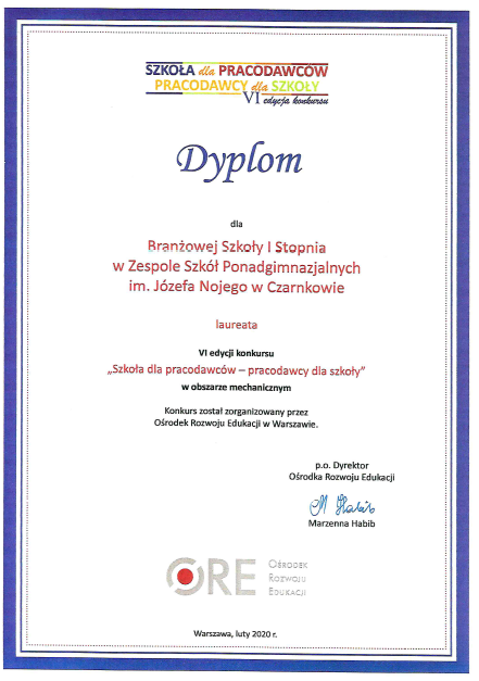 2020 r. w siedzibie ORE w Warszawie. Branżowa Szkoła I stopnia w Zespole Szkół im. Józefa Nojego w Czarnkowie oraz Steico Sp. z o.o. w Czarnkowie zostały laureatami konkursu w branży mechanicznej. Szósta edycja Ogólnopolskiego Konkursu, pod nazwą „Szkoła dla pracodawców – pracodawcy dla szkoły” miała służyć promocji dobrych praktyk w zakresie współpracy szkół zawodowych z pracodawcami, a głównym jego celem było wyłonienie i promocja szkół oraz pracodawców osiągających wysoką jakość i efektywność współpracy w kształceniu zawodowym w wybranych obszarach. Zadaniem szkoły było zaprezentowanie ,,dobrej praktyki” w zakresie współpracy z wybranym pracodawcą. Opisaliśmy przedsięwzięcia wdrożone do działalności szkoły wspólnie z firmą Steico, które miały wpływ na poprawę efektywności kształcenia. Zapewnienie adekwatności kształcenia do potrzeb rynku pracy nie jest możliwe bez współpracy szkoły z pracodawcami, którzy posiadają największą wiedzę na temat zapotrzebowania na kwalifikacje i zawody. Dobrze zorganizowana i ściśle współpracująca z pracodawcami szkoła to szansa dla regionu i społeczności lokalnej. Duży wpływ na odniesienie sukcesu w prestiżowym konkursie miało utworzenie „klas patronackich” objętych patronatem firmy Steico. Patron w umowie zawartej ze szkołą zadeklarował wsparcie procesu kształcenia, w różnych formach oraz uczestniczył w opracowaniu programu nauczania dopasowanego do profilu zapotrzebowania jego firmy. Wspólne działania przyczyniły się do ogólnopolskiego sukcesu szkoły i pracodawcy.