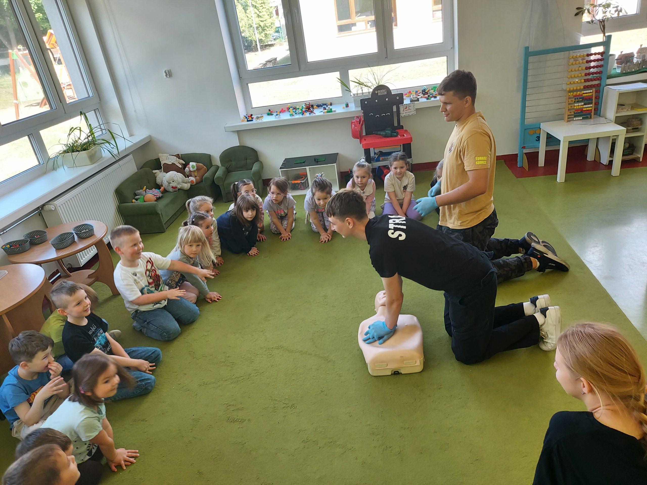Nasza młodzież stanęła na wysokości zadania. Wcieliła się w rolę nauczycieli i uczyła swoich młodszych kolegów i koleżanki postępowania z osobą nieprzytomną. Oprócz numerów alarmowych była rozmowa z dyspozytorem oraz podejście do osoby poszkodowanej. Następnie przedszkolaki pod czujnym okiem Julii, Marcina i Tomka sprawdzały oddech, układały poszkodowanego w pozycji bocznej bezpiecznej oraz wykonywały resuscytację krążeniowo-oddechową.