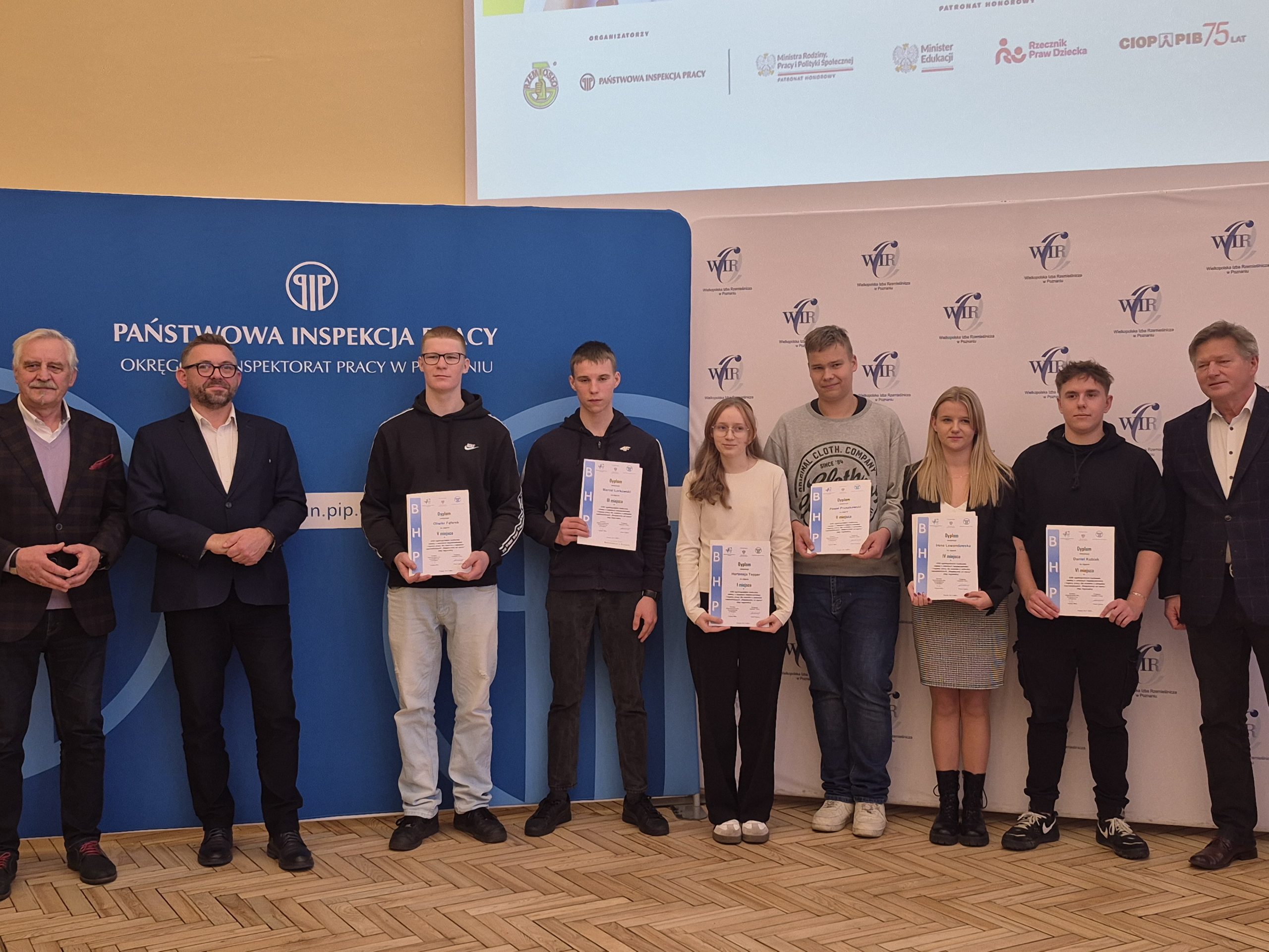4 listopada nasi uczniowie, Oliwier Fąferek i Marcel Lorkowski, z klasy 3c BS1 reprezentowali szkołę w konkursie „ BEZPIECZNIE OD STARTU”. Celem konkursu jest popularyzowanie wiedzy z zakresu podstawowych przepisów prawnej ochrony pracy oraz zasad bezpieczeństwa i higieny pracy wśród uczniów zawodu w rzemiośle. Uczniowie już od miesiąca zgłębiali zagadnienia dotyczące prawa pracy, technicznego bezpieczeństwa pracy, ergonomii, psychologii pracy, ochrony przeciwpożarowej oraz zasad udzielania pierwszej pomocy. W siedzibie Wielkopolskiej Izby Rzemieślniczej czekało na nich wyzwanie, test wiedzy składający się z czterdziestu pytań i godzinny limit czasowy na jego rozwiązanie. Efektem tych zmagań było zajęcie przez Marcela trzeciego , a Oliwiera piątego miejsca. W ten sposób znaleźli się oni w gronie najlepszych w Wielkopolsce, w znajomości zagadnień prawa pracy i BHP. Zdobywcy dwóch pierwszych lokat będą reprezentowali nasz region na etapie centralnym w Warszawie. Gratulujemy osiągniętego sukcesu!!!