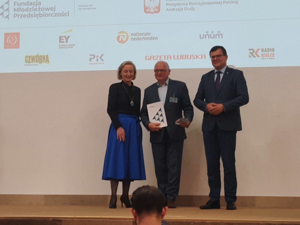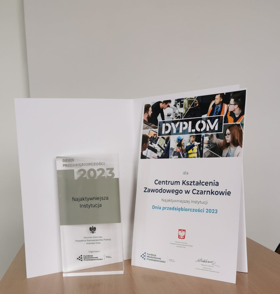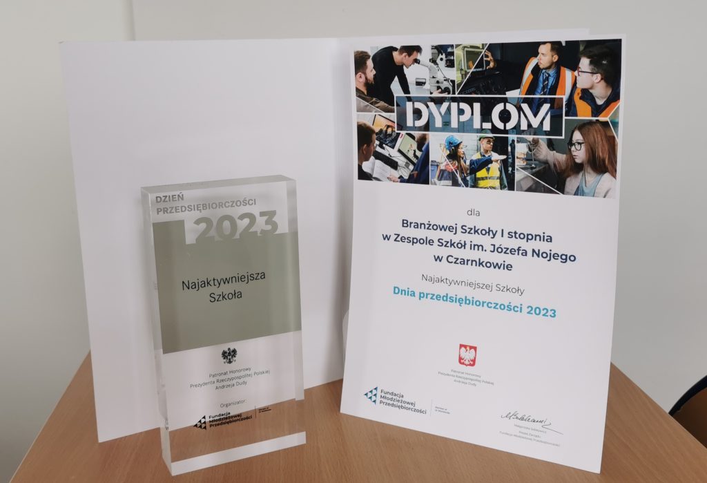 Tytuł Najaktywniejszej Szkoły w „Dniu przedsiębiorczości” 2023 w kategorii 10 najaktywniejszych szkół w kraju dla Branżowej Szkoły I Stopnia z Zespołu Szkół im. Józefa Nojego w Czarnkowie oraz Najaktywniejszej Instytucji dla Centrum Kształcenia Zawodowego w Czarnkowie odebrał Pan dyrektor Jan Palacz.