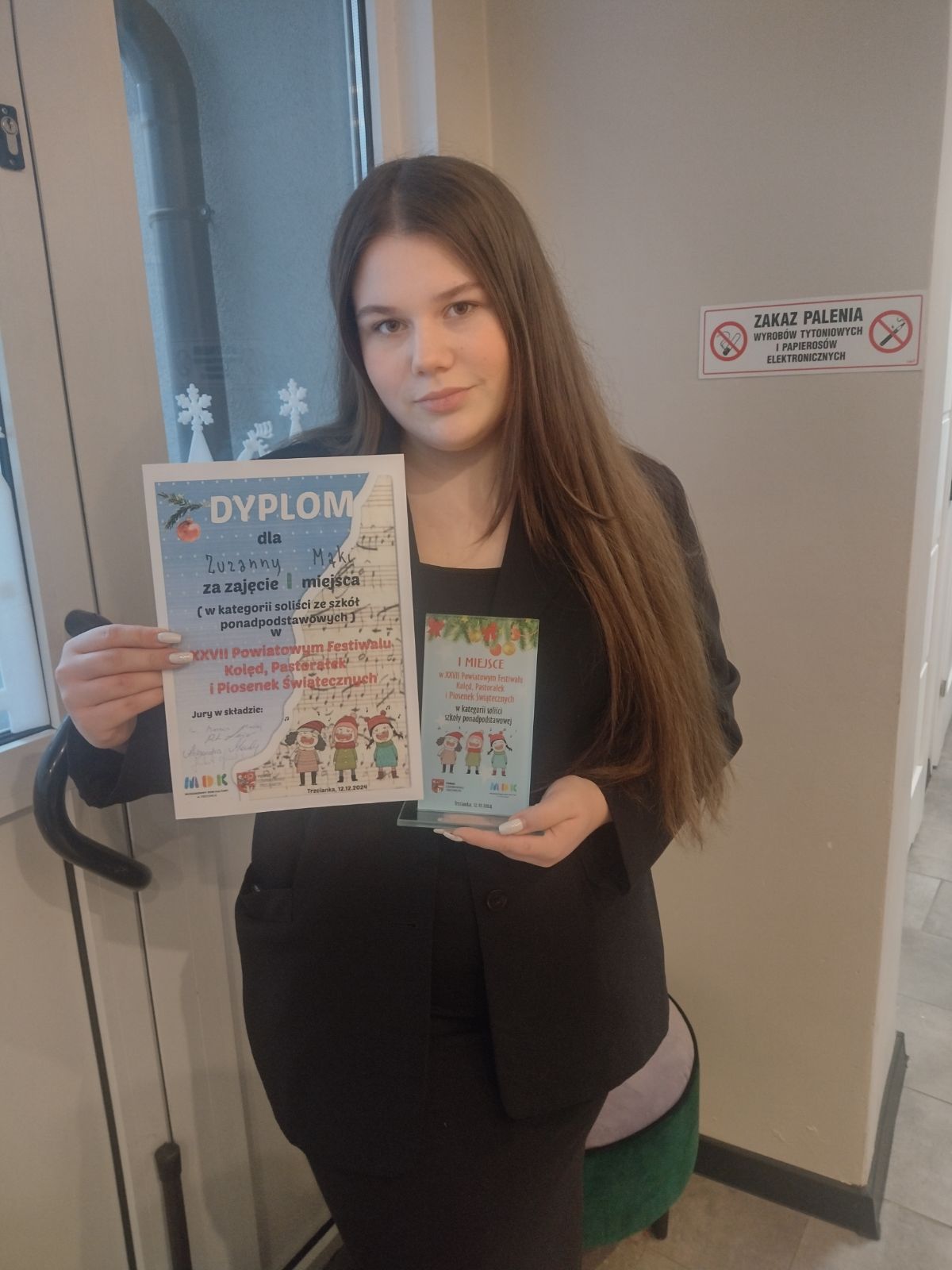 XXVII Powiatowy Festiwal Kolęd i Pastorałek i Piosenek Świątecznych odbył się 12 grudnia 2024r. w MDK w Trzciance. W tym konkursie Zespół Szkół im. Józefa Nojego w Czarnkowie reprezentowała uczennica klasy 2TLE, Zuzanna Mąka. Umiejętności wokalne Zuzy zostały zauważone przez jury konkursowe, które postanowiło przyznać jej zaszczytne I miejsce za prezentację piosenki Świąteczny blues.