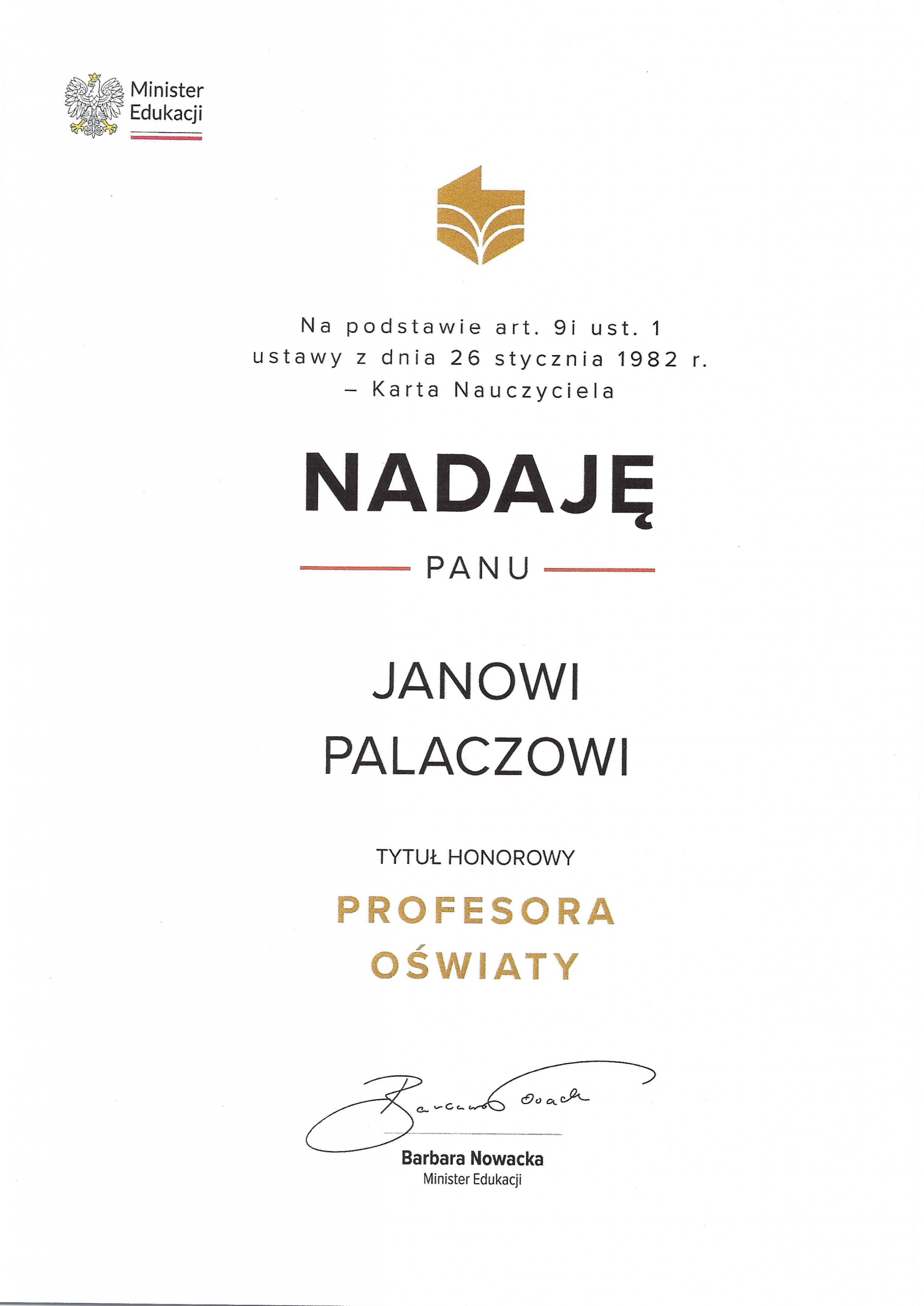 W tej sytuacji nie dziwi fakt, że TYTUŁ HONOROWY PROFESORA OŚWIATY został przyznany przez Ministra Edukacji na wniosek Kapituły dyrektorowi szkoły, Panu Janowi Palaczowi, jako zasłużonemu nauczycielowi dyplomowanemu za wybitne osiągnięcia dydaktyczne, naukowe i organizacyjne.